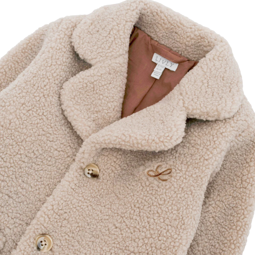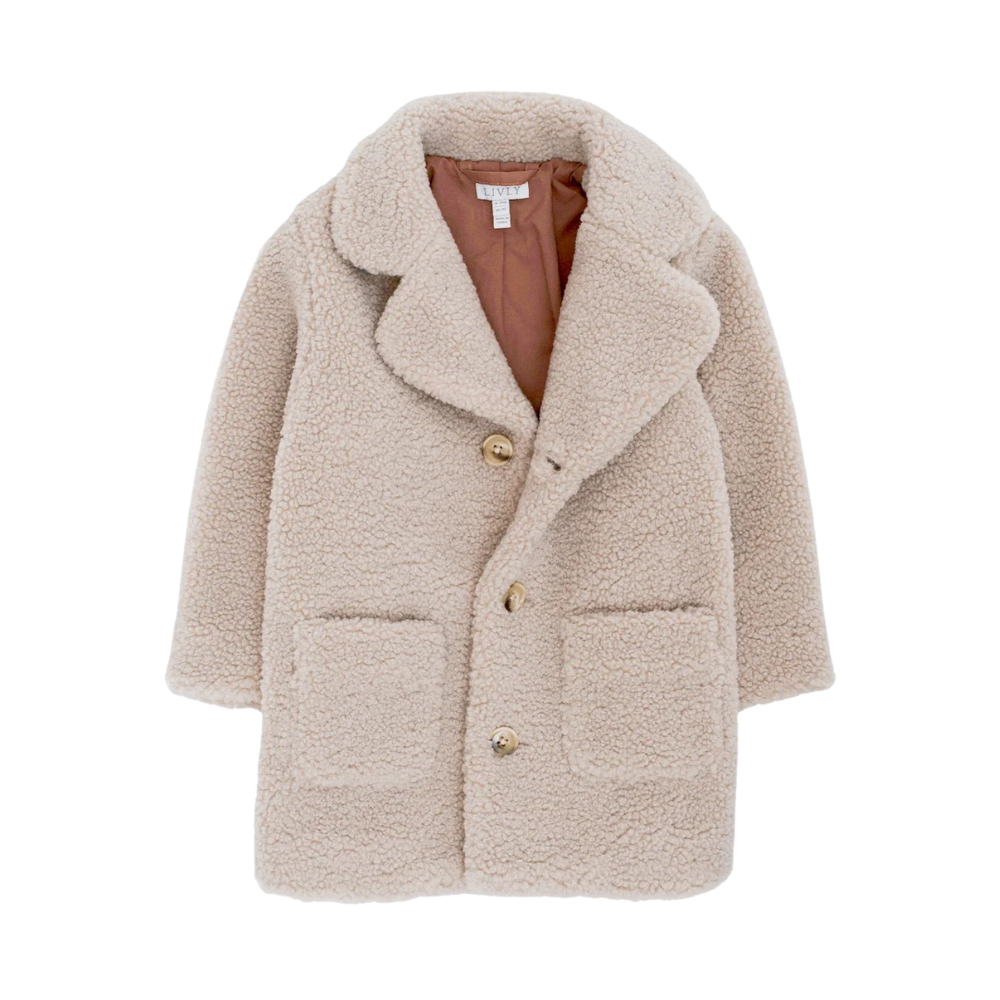 Falleg, hneppt kápa frá Livly með kraga. Kápan er úr mjúku bangsaflísi með opnum vösum að framan.