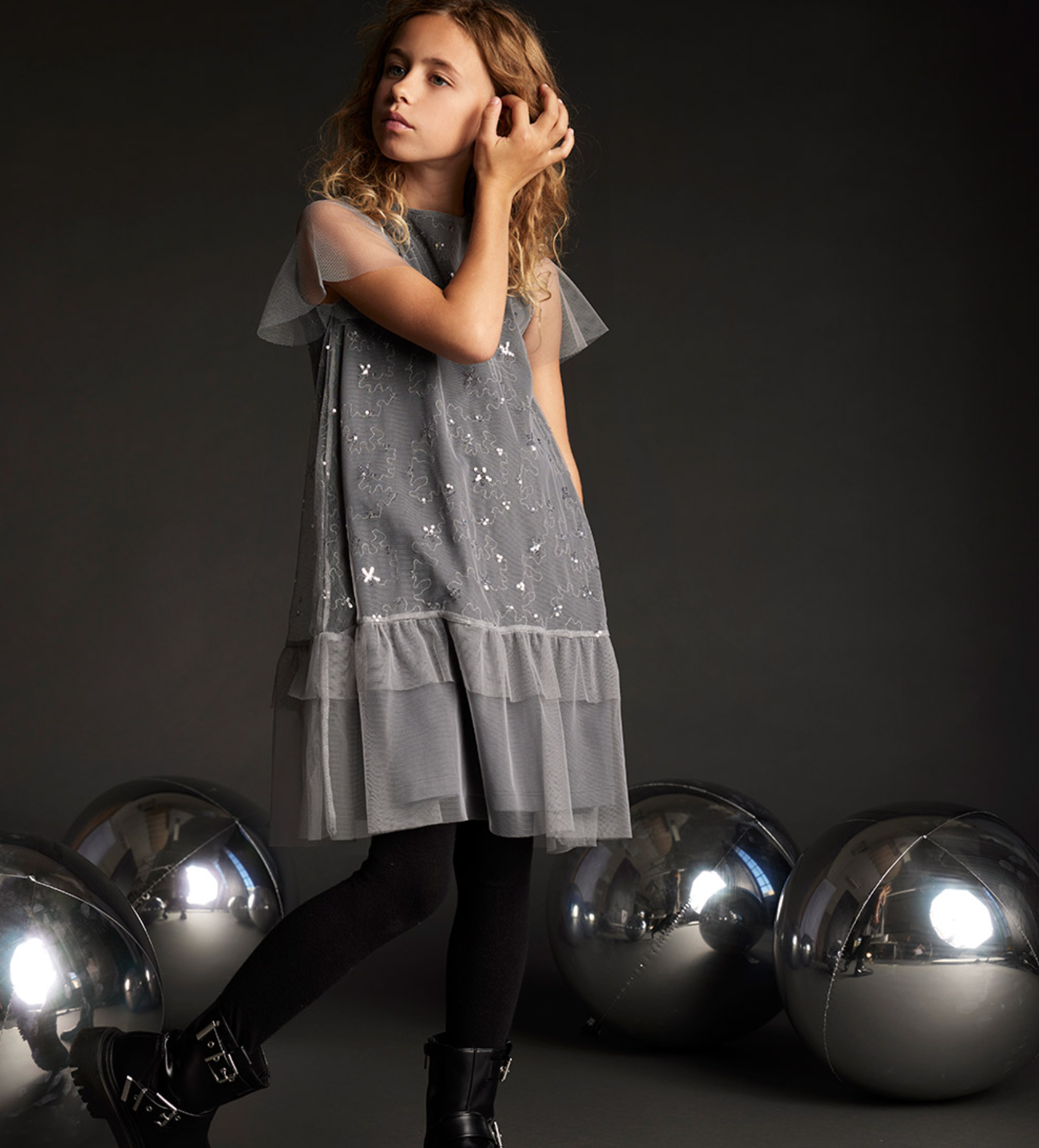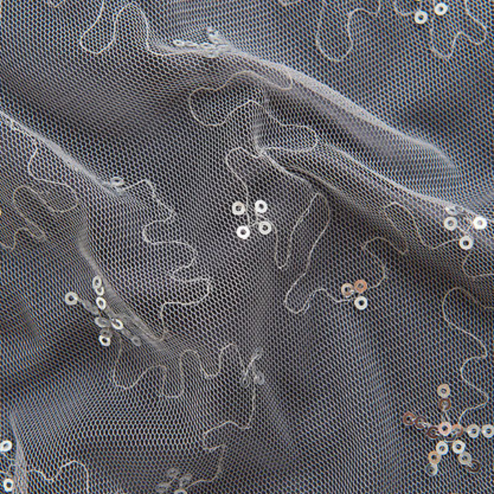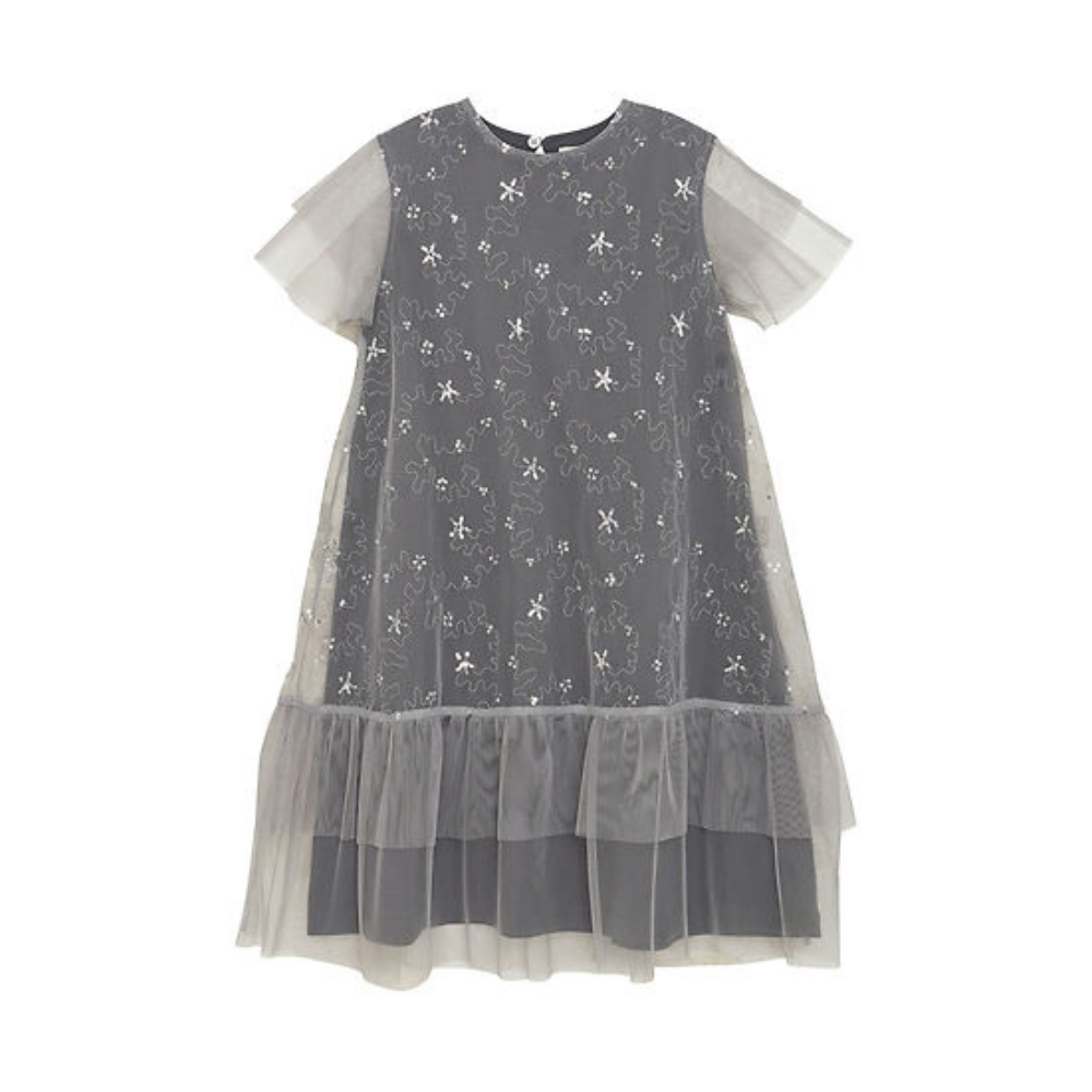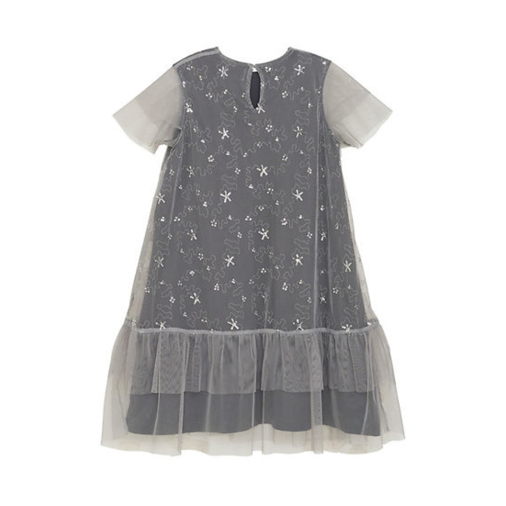 Fallegur kjóll með stuttum ermum og silfruðum palliettum.