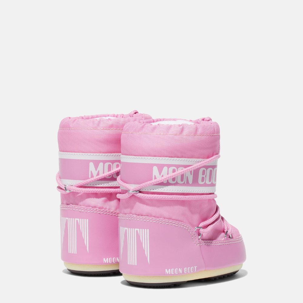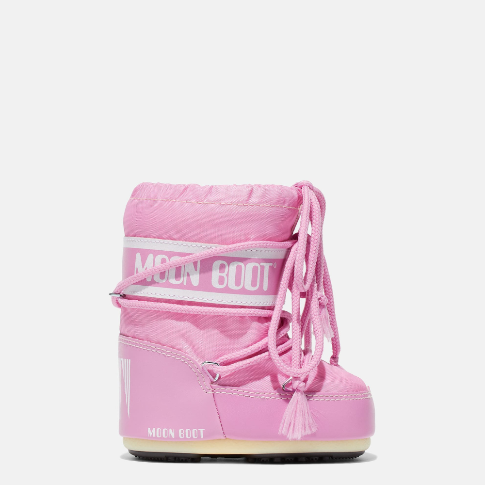 Bleik Moon Boot. Skórnir eru innblásnir af tungl lendingunni 1969 og eru vel einangraðir með léttum millisóla og gripmiklum gúmmí sóla. Skórnir eru fóðraðir með svokölluðu froðufóðri sem hefur verið hannað til að laga sig að fætinum og veitir fullkomin þægindi. Fóðrið býður upp á þann eiginleika að hvert par spannar allt að þrjár stærðir.