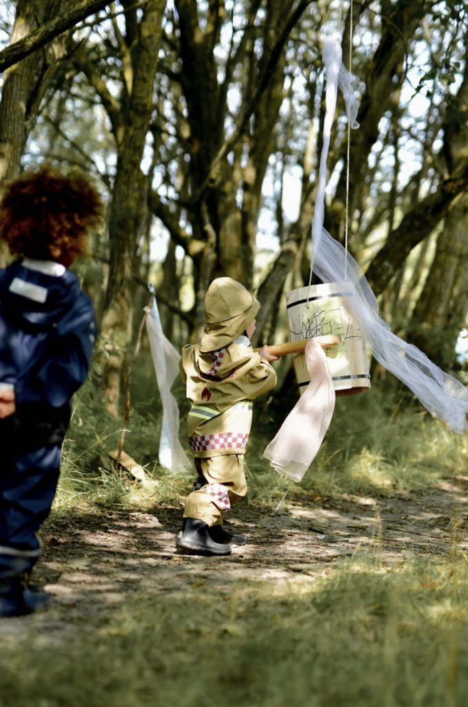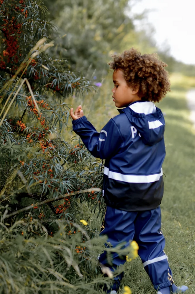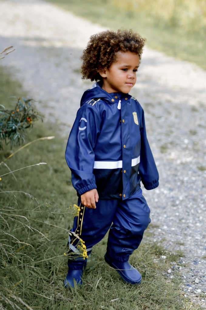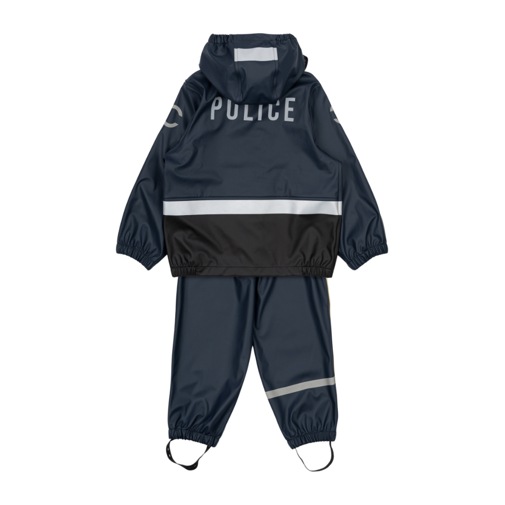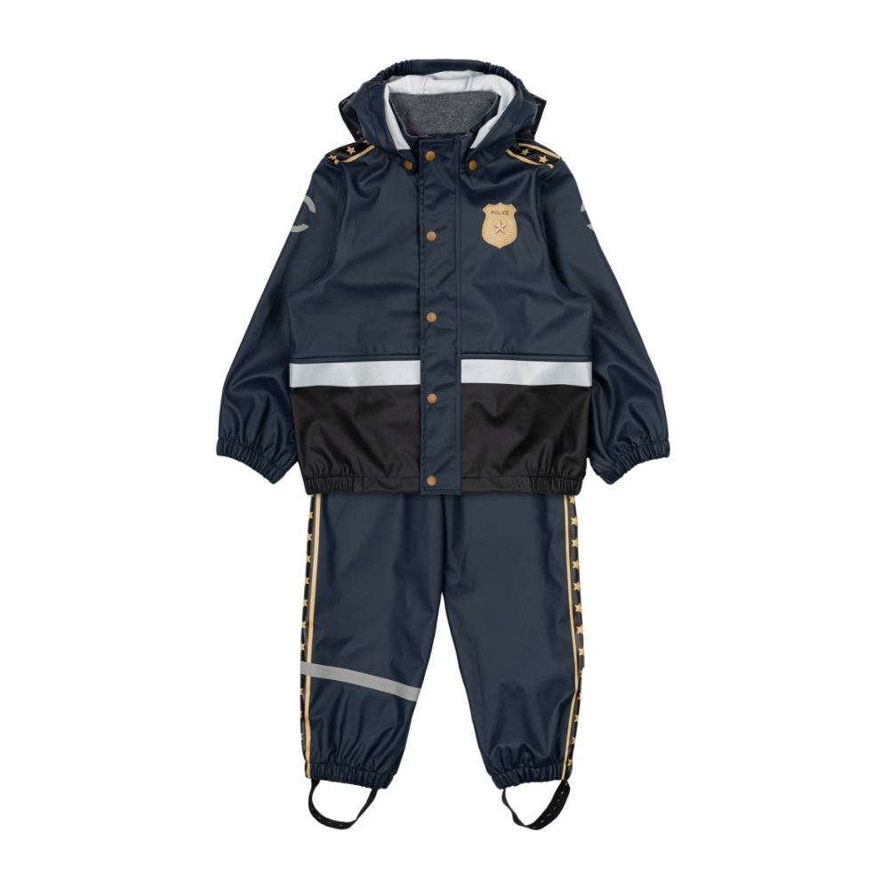 Dökk blár regngalli frá Mikk-line í líki löggubúnings. Jakkinn er bæði renndur og smelltur að framan og með hettu sem hægt er að fjarlægja. Buxur í stærðum 110 og minna eru með háu mitti og axlaböndum sem hægt er að stilla. Stærðir 116-128 koma með mittisbuxum sem hægt er að þrengja í mittið.