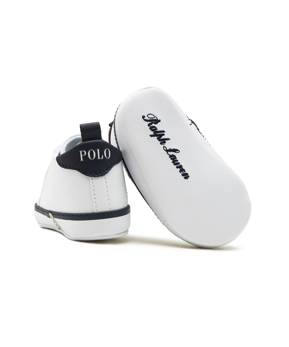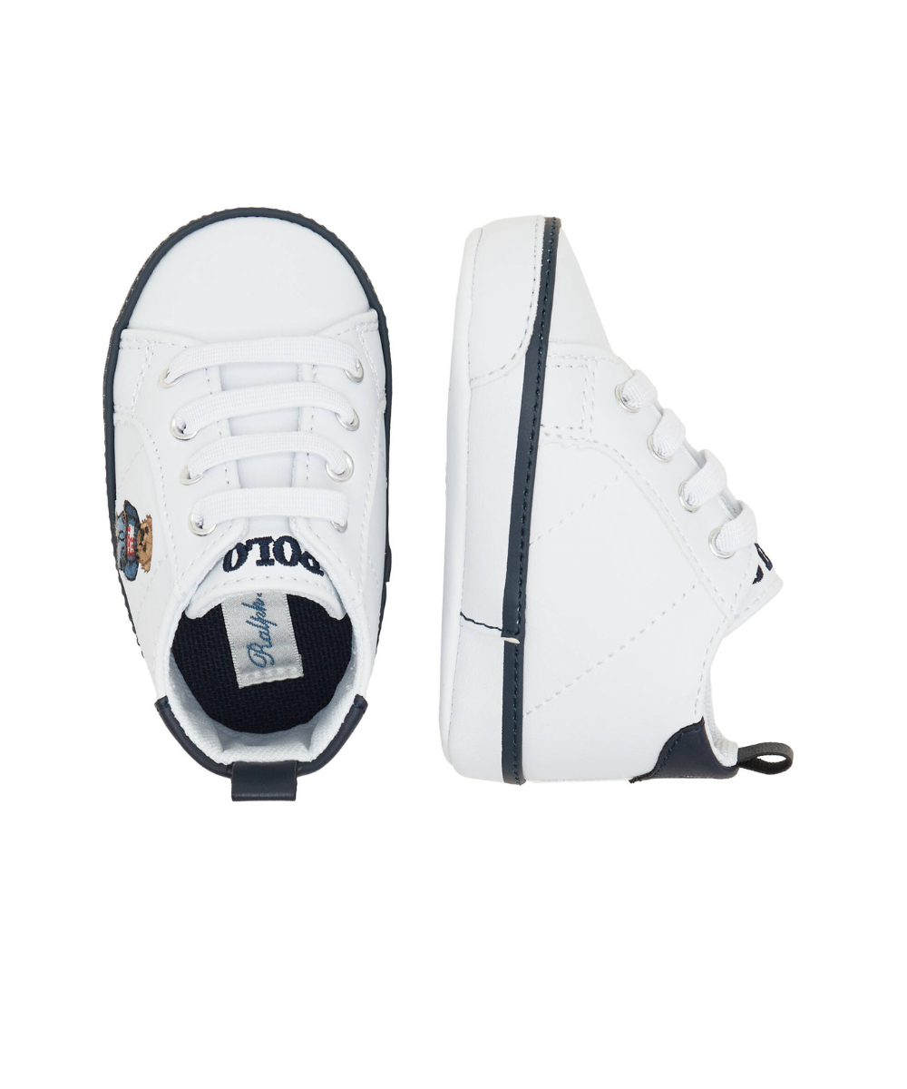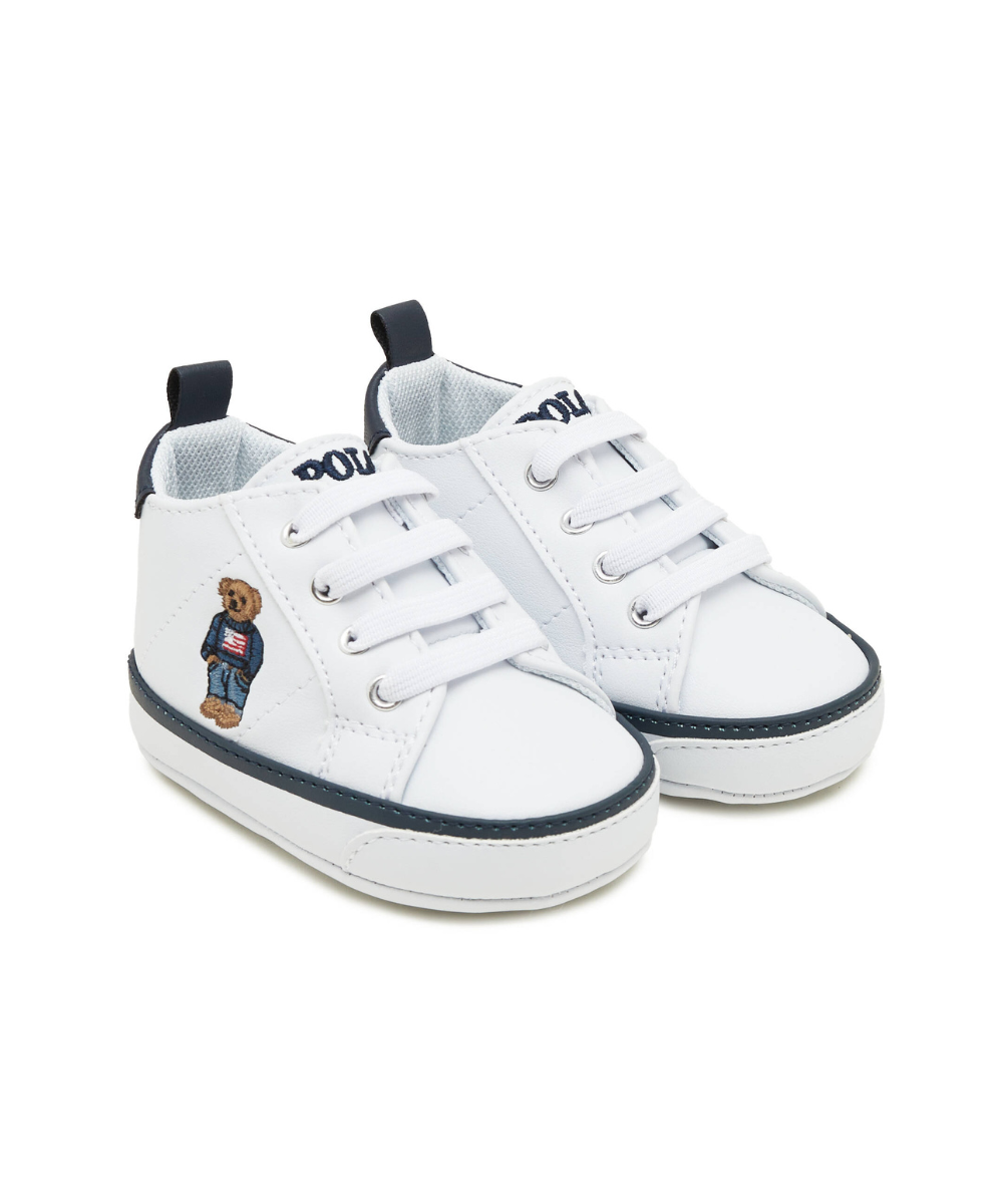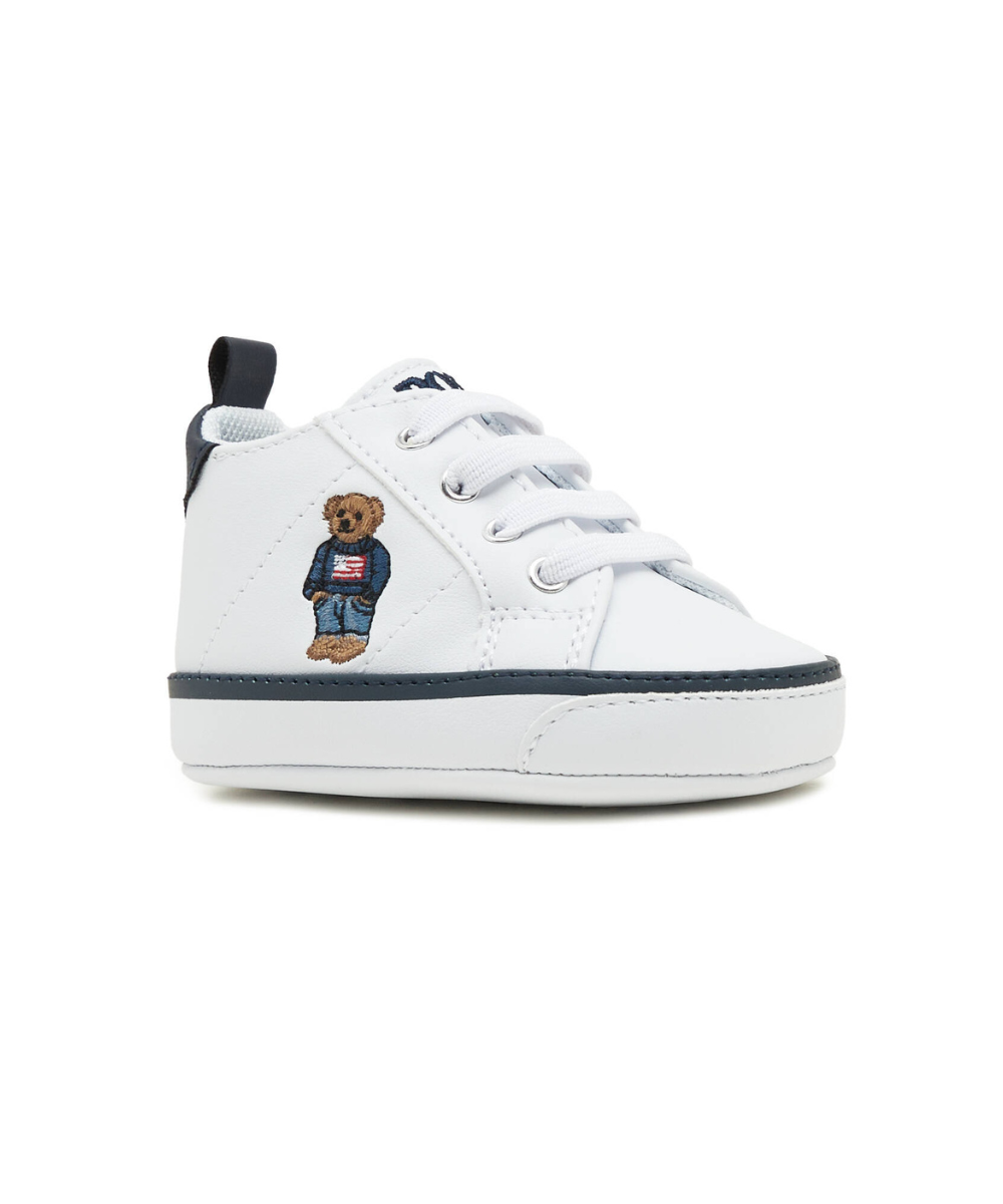 Mjúkir, ungbarnaskór með bangsa frá Polo Ralph Lauren. Skórnir eru hvítir með dökkbláum hælkappa og teygju reimum.